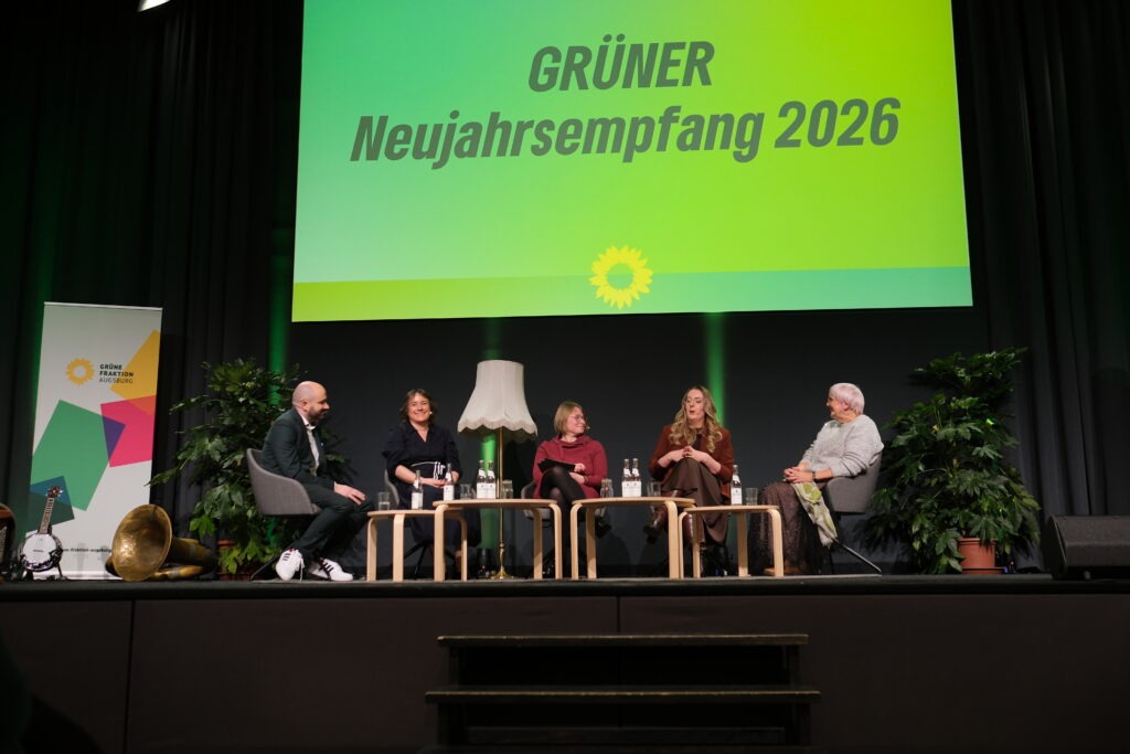 Es war der letzte Neujahrsempfang in dieser Stadtratsperiode, den die Grüne Stadtratsfraktion am 1. Februar im westhouse in Kriegshaber gefeiert hat. Rund 400 Gäste haben zusammen mit der Grünen Bundesfraktionsvorsitzenden Katharina Dröge, Claudia Roth, Fachsprecherin für wirtschaftliche Zusammenarbeit und Entwicklung der Grünen Bundestagsfraktion, Bürgermeisterin und OB-Kandidatin Martina Wild, Peter Rauscher, Vorsitzender der Grünen Stadtratsfraktion und Hannah Judith, Vorsitzende des Grünen Stadtverbands, das Wahljahr begrüßt und auf sechs bewegte Jahre zurückgeblickt.