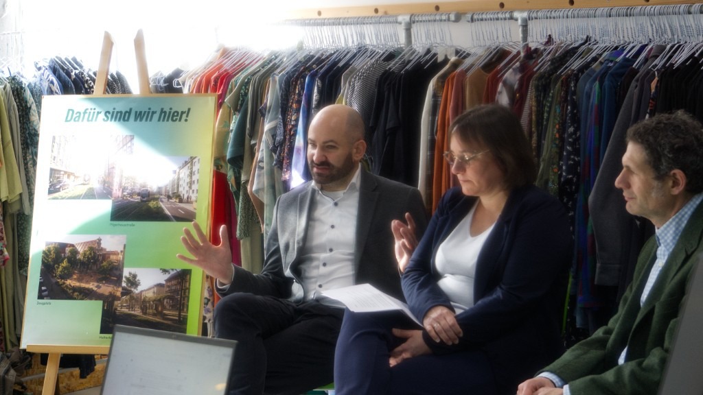 Am Freitag, den 20.02. haben wir gemeinsam mit unserer Oberbürgermeisterkandidatin Martina Wild, unserem Fraktionsvorsitzenden Peter Rauscher und unserem mobilitätspolitischen Sprecher Dr. Deniz Anan zentrale Vorhaben für eine klimagerechte, sozial gerechte und wirtschaftlich starke Stadt vorgestellt. Der Ort der Pressekonferenz – das nachhaltige Augsburger Modelabel degree im Suslet – steht exemplarisch für das grüne Leitmotiv: Ökologie, soziale Verantwortung und wirtschaftlicher Erfolg gehören zusammen. Um zu zeigen, wie diese Strategie konkret im Stadtbild aussehen kann, stellten wir GRÜNEN der Presse zusätzlich Visualisierungen ausgewählter Orte vor. Die Bilder machen greifbar, was Klimaanpassung, Artenschutz und eine gerechte Mobilitätswende im Alltag bedeuten: mehr Grün statt Asphalt, sichere Wege für Rad und Fußverkehr, schattige Plätze, begrünte Dächer und eine leistungsfähige Straßenbahn.